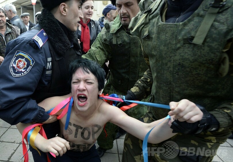 【3月7日 AFP】ウクライナ南部クリミア(Crimea)自治共和国の首都シンフェロポリ(Simferopol)で6日、議事堂前で行われていた親ロシア派の集会に女性権利団体「FEMEN」のメンバーたちが乱入して警察に身柄を拘束された。(c)AFP