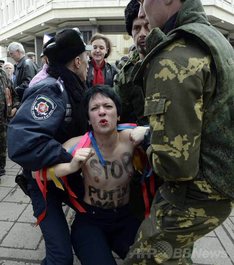【3月7日 AFP】ウクライナ南部クリミア(Crimea)自治共和国の首都シンフェロポリ(Simferopol)で6日、議事堂前で行われていた親ロシア派の集会に女性権利団体「FEMEN」のメンバーたちが乱入して警察に身柄を拘束された。(c)AFP
