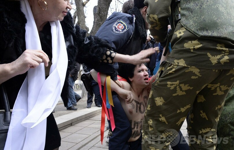 【3月7日 AFP】ウクライナ南部クリミア(Crimea)自治共和国の首都シンフェロポリ(Simferopol)で6日、議事堂前で行われていた親ロシア派の集会に女性権利団体「FEMEN」のメンバーたちが乱入して警察に身柄を拘束された。(c)AFP