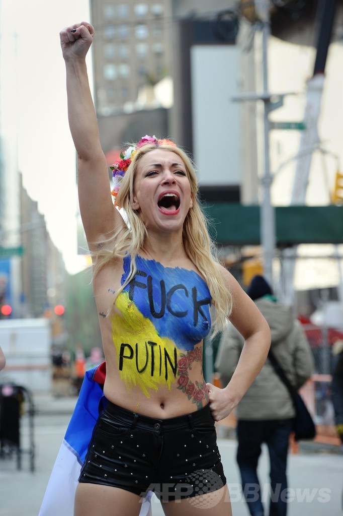 ウクライナの国旗の色に塗った胸にウラジーミル・プーチン(Vladimir Putin)露大統領を非難するメッセージを書き込んだインナ・シェフチェンコ(Inna Shevchenko)代表らFEMENメンバーは、ロシアのウクライナへの介入に抗議するとともに、米国による対ロシア制裁の支持を訴えた。(c)AFP