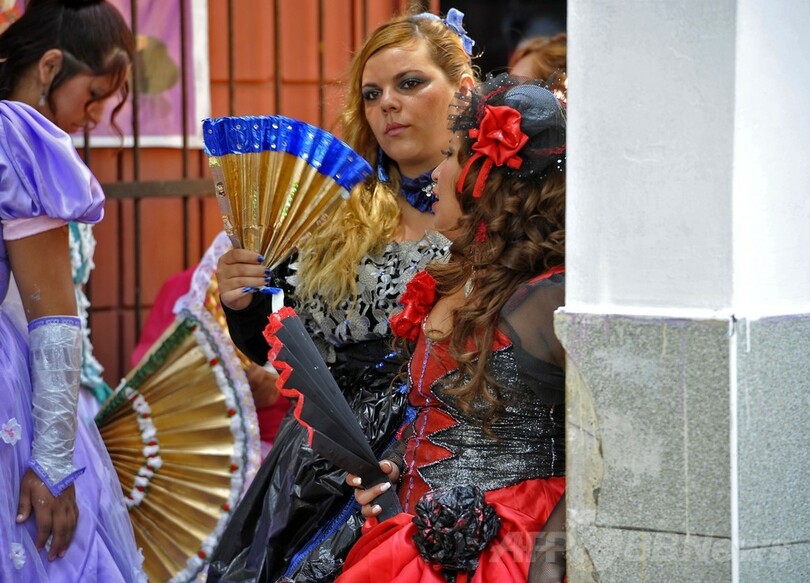 【3月8日 AFP】ペルーの首都リマ(Lima)にある刑務所で6日、女性受刑者たちがリサイクルした素材を使って制作したコロニアル風のドレスを身にまとい、「国際女性の日(International Women's Day)」を記念するミュージカルを上演した。(c)AFP
