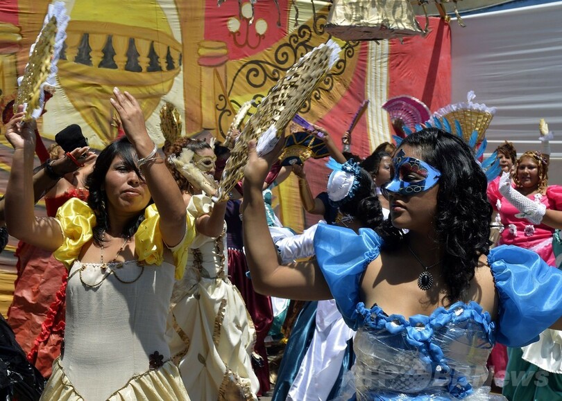 【3月8日 AFP】ペルーの首都リマ(Lima)にある刑務所で6日、女性受刑者たちがリサイクルした素材を使って制作したコロニアル風のドレスを身にまとい、「国際女性の日(International Women's Day)」を記念するミュージカルを上演した。(c)AFP