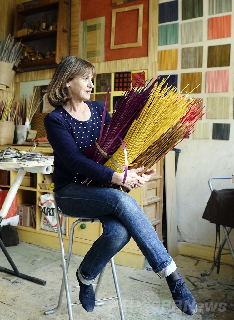 麦わら象眼細工は17世紀から続くフランス伝統の工芸技術だが、数十年前に廃れていた。その伝統をよみがえらせたドゥ・コーヌさんは、昔ながらの農法で栽培され、収穫されたライ麦のわらを使って、美しい作品の数々を生み出している。(c)AFP