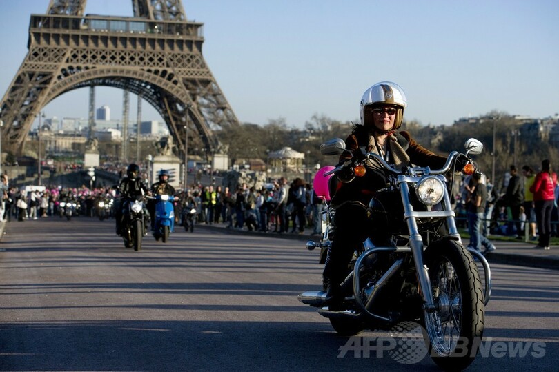 【3月10日 AFP】フランス各地で9日、「国際女性の日(International Women's Day)」を記念してオートバイに乗る女性たちのためのイベント「Toutes en Moto(皆でオートバイに乗ろう)」が開催され、首都パリ(Paris)ではエッフェル塔(Eiffel Tower)前に多数の女性二輪ライダーが集結した。(c)AFP