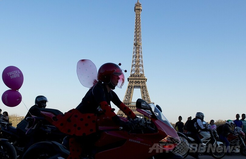 【3月10日 AFP】フランス各地で9日、「国際女性の日(International Women's Day)」を記念してオートバイに乗る女性たちのためのイベント「Toutes en Moto(皆でオートバイに乗ろう)」が開催され、首都パリ(Paris)ではエッフェル塔(Eiffel Tower)前に多数の女性二輪ライダーが集結した。(c)AFP