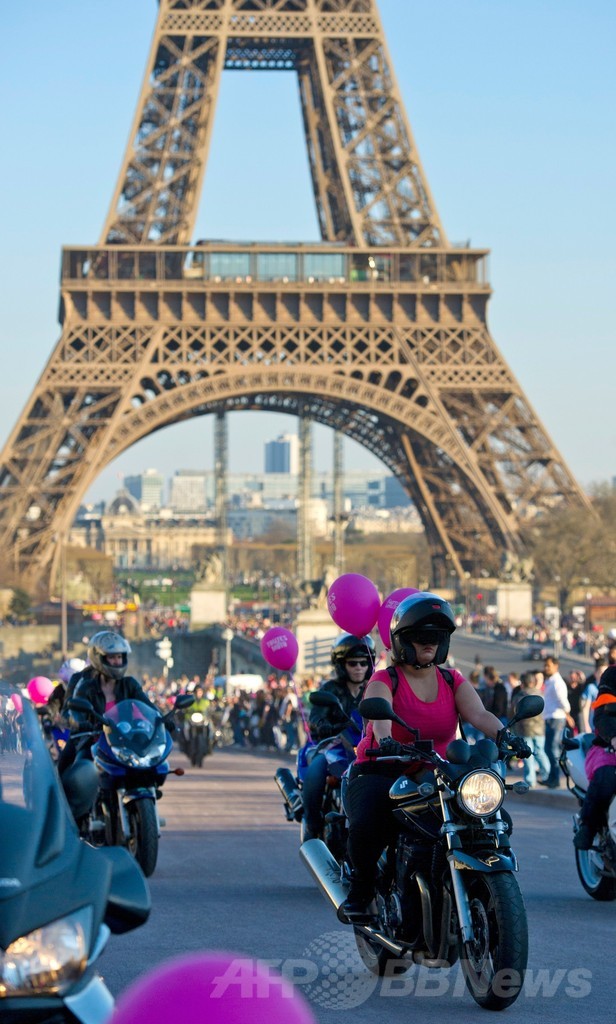 【3月10日 AFP】フランス各地で9日、「国際女性の日(International Women's Day)」を記念してオートバイに乗る女性たちのためのイベント「Toutes en Moto(皆でオートバイに乗ろう)」が開催され、首都パリ(Paris)ではエッフェル塔(Eiffel Tower)前に多数の女性二輪ライダーが集結した。(c)AFP