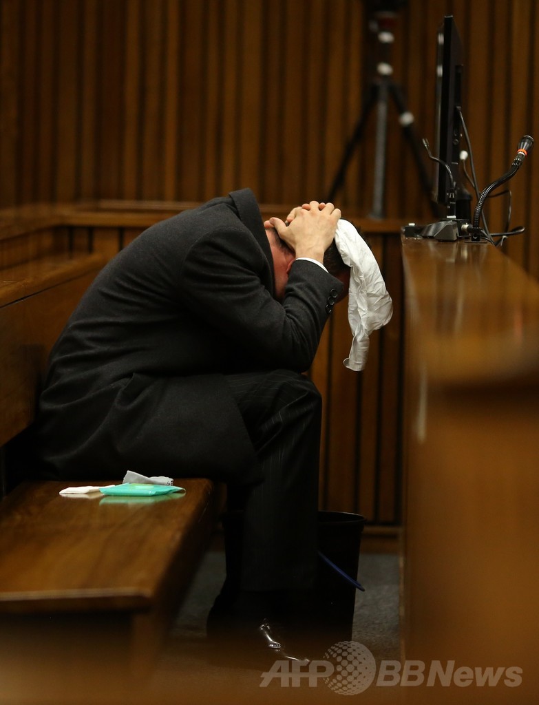 同被告はこの日の公判が終了しても、被告席に突っ伏したままで動かず、兄のカール(Carl Pistorius)さんと妹のエイミー(Aimee Pistorius)さんに慰められてようやく心を落ち着けた様子だった。約10分後、同被告はエイミーさんに腕を支えられて法廷を後にした。(c)AFP/Stephanie Findlay