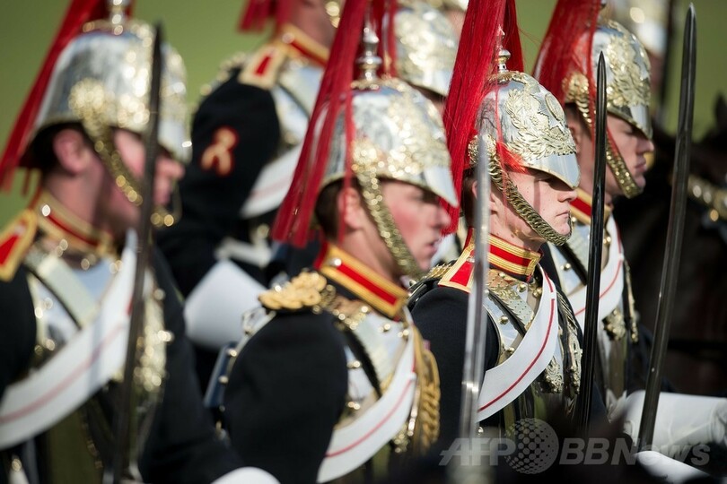【3月21日 AFP】英ロンドン(London)のハイド・パーク(Hyde Park)で20日、近衛騎兵隊騎馬連隊(Household Cavalry Mounted Regiment)の閲兵式が行われた。毎年恒例のこの閲兵式では、騎兵隊が国家的な式典での任務遂行に必要な技術水準に達しているかを英陸軍の少将が閲兵し、確認する。(c)AFP
