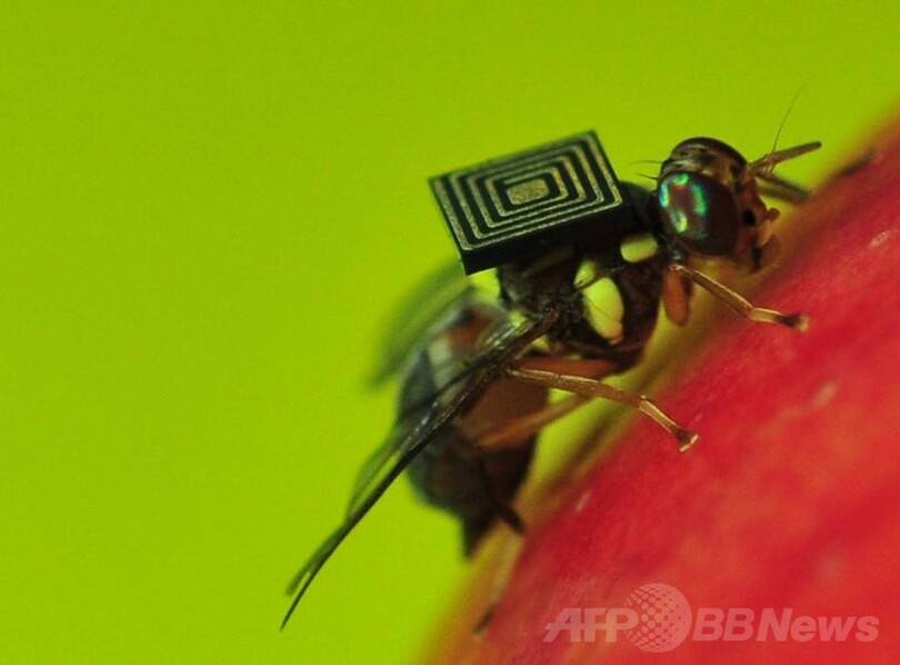 【3月23日 AFP】オーストラリア連邦科学産業研究機構(Commonwealth Scientific and Industrial Research Organisation、CSIRO)によって背中に1.5ミリのセンサーチップを貼り付けられた体長8ミリのクインスランドミバエ(Queensland fruit fly)。