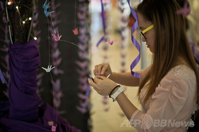 【3月24日 AFP】消息を絶ったマレーシア航空(Malaysia Airlines)MH370便の乗客乗員の無事を祈り、マレーシア・クアラルンプール(Kuala Lumpur)のショッピングモール内に千羽鶴が飾られた。中にはメッセージの綴られた折り鶴もみられた。(c)AFP