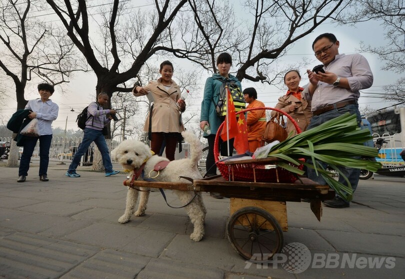 【3月27日 AFP】中国・北京(Beijing)で26日、飼い主と一緒に買い物をした後、荷車を引きながら家路に就く犬の姿が、道行く人たちの目を引いていた。