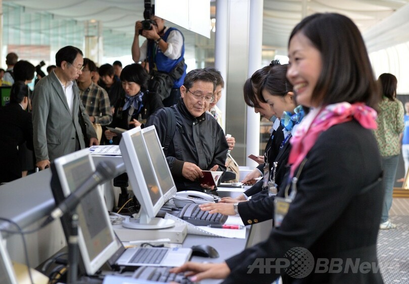 この日ターミナルで行われた記念式典では全日空の篠辺修(Osamu Shinobe)社長がテープカットをしたほか、旅行客に記念の日本酒が振る舞われた。(c)AFP