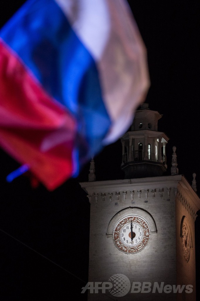 【3月30日 AFP】ロシアに編入されたクリミア(Crimea)半島はモスクワ(Moscow)時間に移行することになり、 クリミア自治共和国の首都シンフェロポリ(Simferopol)で29日夜、駅の時計の時刻をモスクワ時間に合わせる式典が行われた。