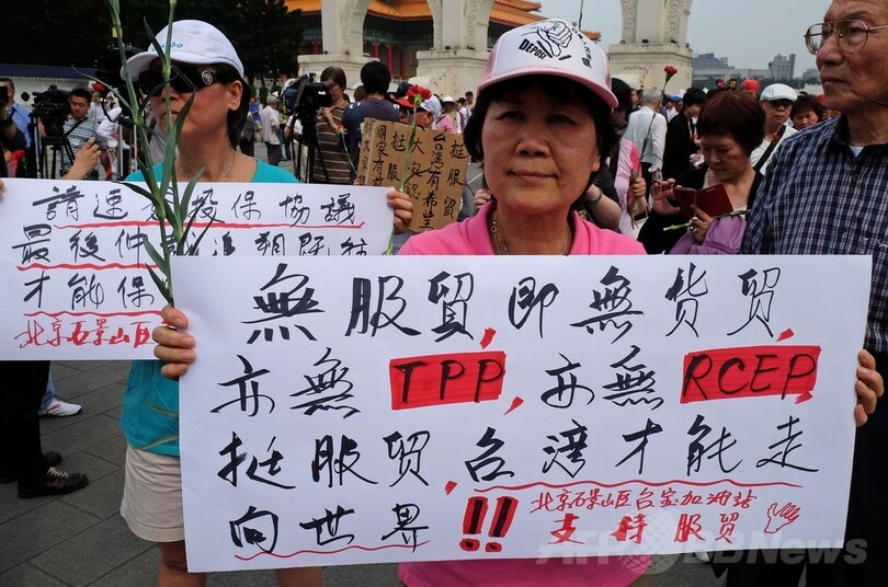 馬総統は前日、中国と交わされる全協定の内容を監視する新法を導入するとの譲歩案を提示していたが、総統府につながる通りはこの日、黒シャツを着て「民主主義を守れ。サービス貿易協定を撤回しろ」と書かれたはちまきを着けるなどした人々で埋め尽くされた。