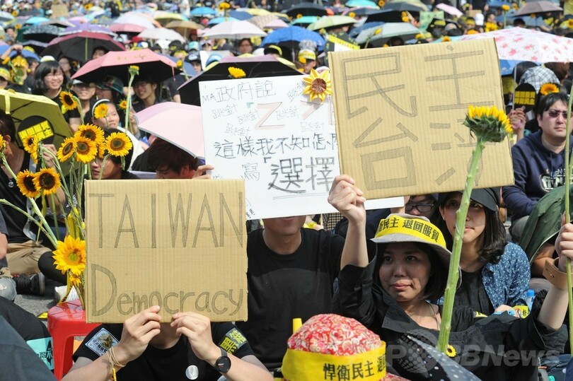 馬総統は前日、中国と交わされる全協定の内容を監視する新法を導入するとの譲歩案を提示していたが、総統府につながる通りはこの日、黒シャツを着て「民主主義を守れ。サービス貿易協定を撤回しろ」と書かれたはちまきを着けるなどした人々で埋め尽くされた。