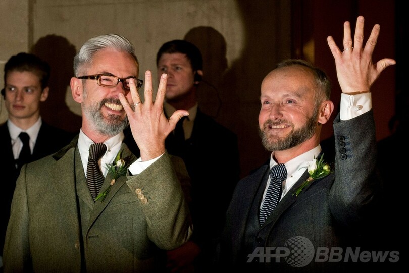 ニュース ライフ 【写真特集】英国で同性婚解禁、幸せカップルが続々挙式 2014年3月31日 19:39 発信地:英国 [ ヨーロッパ 英国 ] このニュースをシェア ‹ › ❮ 22/29 ❯ 英ブライトン(Brighton)のパビリオン宮殿(Royal Pavillion)で挙式した後に結婚指輪を見せるアンドリュー・ウェール(Andrew Wale)さん(左)とニール・アラード(Neil Allard)さん(2014年3月29日撮影)。(c)AFP/LEON NEAL 画像作成中 ! 【3月31日 AFP】英国で初めて同性婚が合法化された29日、新法が施行されたイングランド(England)とウェールズ(Wales)の各地では、幸せそうな表情を浮かべた同性カップルが次々と誓いの言葉を交わした。(c)AFP ライフ 一覧へ> メディア・報道関係・法人の方向け 写真・動画 購入のお問合せ>