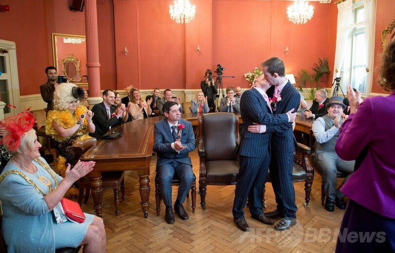 ニュース ライフ 【写真特集】英国で同性婚解禁、幸せカップルが続々挙式 2014年3月31日 19:39 発信地:英国 [ ヨーロッパ 英国 ] このニュースをシェア ‹ › ❮ 12/29 ❯ 英ブライトン(Brighton)で挙式するフィル・ロバサン(Phil Robathan)さん(左)とジェームズ・プレストン(James Preston)さん(2014年3月29日撮影)。(c)AFP/LEON NEAL 画像作成中 ! 【3月31日 AFP】英国で初めて同性婚が合法化された29日、新法が施行されたイングランド(England)とウェールズ(Wales)の各地では、幸せそうな表情を浮かべた同性カップルが次々と誓いの言葉を交わした。(c)AFP ライフ 一覧へ> メディア・報道関係・法人の方向け 写真・動画 購入のお問合せ>
