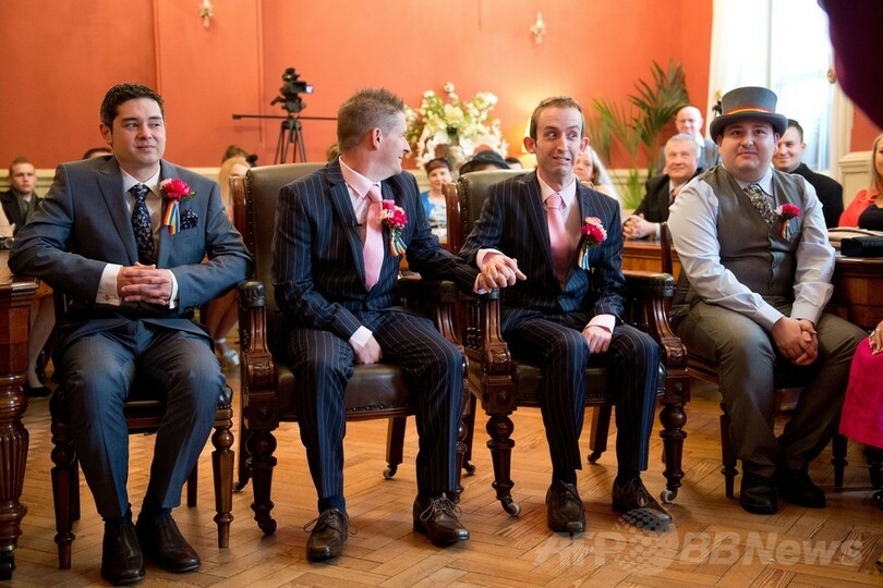 ニュース ライフ 【写真特集】英国で同性婚解禁、幸せカップルが続々挙式 2014年3月31日 19:39 発信地:英国 [ ヨーロッパ 英国 ] このニュースをシェア ‹ › ❮ 15/29 ❯ 英ブライトン(Brighton)で挙式するフィル・ロバサン(Phil Robathan)さん(中央左)とジェームズ・プレストン(James Preston)さん(中央右、2014年3月29日撮影)。(c)AFP/LEON NEAL 画像作成中 ! 【3月31日 AFP】英国で初めて同性婚が合法化された29日、新法が施行されたイングランド(England)とウェールズ(Wales)の各地では、幸せそうな表情を浮かべた同性カップルが次々と誓いの言葉を交わした。(c)AFP ライフ 一覧へ> メディア・報道関係・法人の方向け 写真・動画 購入のお問合せ>
