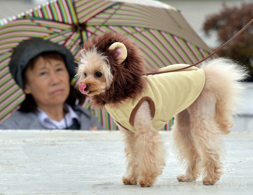 【4月6日 AFP】都内の百貨店、日本橋三越(Mitsukoshi)本店の屋上で5日、同店のシンボルとして知られる正面玄関のライオン像の設置100周年を記念して、コスチュームやトリミングでライオンに「変身」した犬をお披露目するショーが開催された。(c)AFP