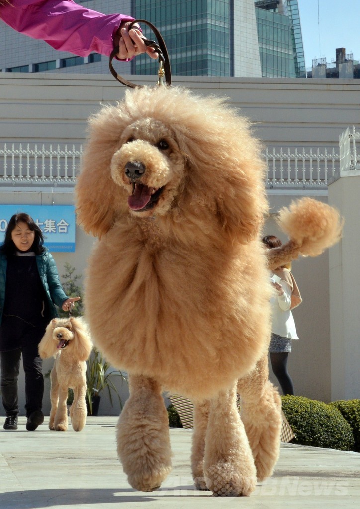 【4月6日 AFP】都内の百貨店、日本橋三越(Mitsukoshi)本店の屋上で5日、同店のシンボルとして知られる正面玄関のライオン像の設置100周年を記念して、コスチュームやトリミングでライオンに「変身」した犬をお披露目するショーが開催された。(c)AFP