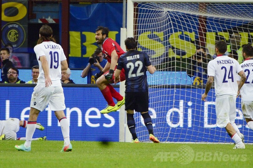 そしてインテルは後半38分、ロドリゴ・パラシオ(Rodrigo Palacio)がペナルティーエリア内で倒されてPKを獲得したが、ミリートのシュートはボローニャのGKジャンルカ・クルチ(Gianluca Curci)にセーブされ、勝ち越すことはできなかった。(c)AFP
