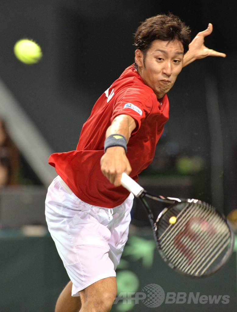 現在の大会形式となって初めて日本を準々決勝進出に導いた錦織圭(Kei Nishikori)が故障のため欠場し、日本の4強入りの望みは薄くなっていた。(c)AFP