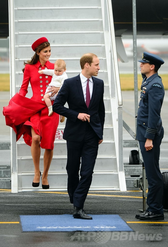 【4月7日 AFP】英国のウィリアム王子(Prince William)とキャサリン妃(Catherine, Duchess of Cambridge)夫妻は7日、長男のジョージ王子(Prince George)を伴ってニュージーランドの首都ウェリントン(Wellington)に到着した。生後8か月のジョージ王子にとって初の外遊となる。