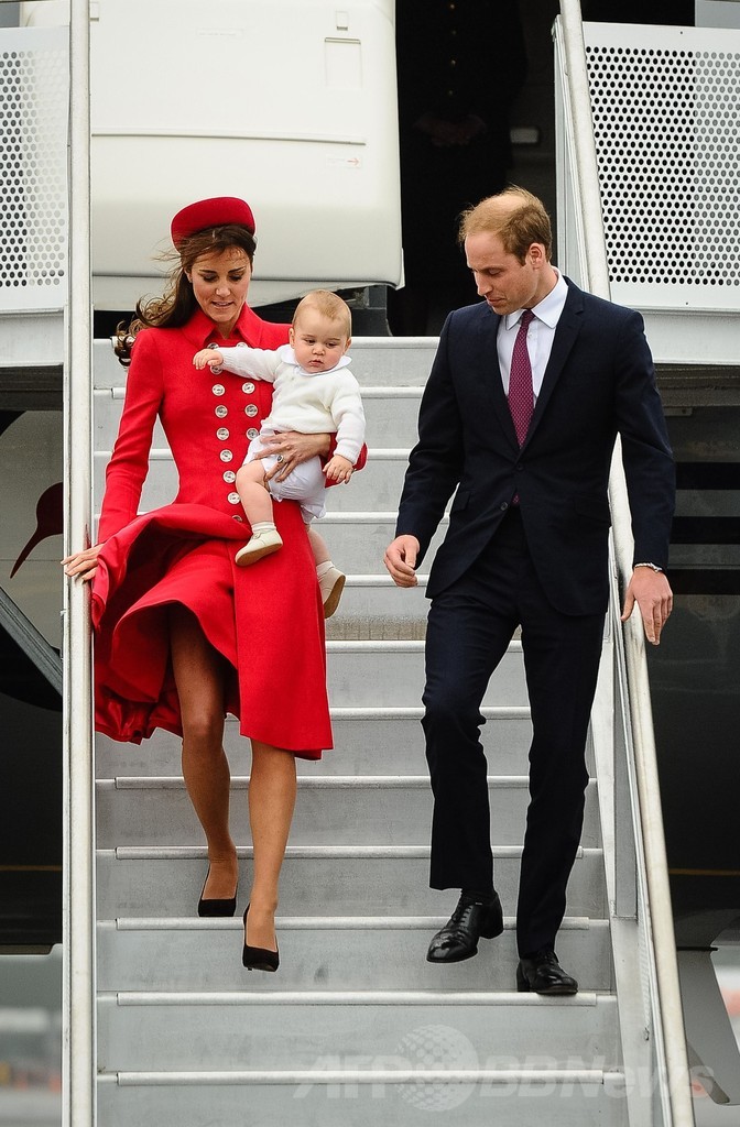 【4月7日 AFP】英国のウィリアム王子(Prince William)とキャサリン妃(Catherine, Duchess of Cambridge)夫妻は7日、長男のジョージ王子(Prince George)を伴ってニュージーランドの首都ウェリントン(Wellington)に到着した。生後8か月のジョージ王子にとって初の外遊となる。