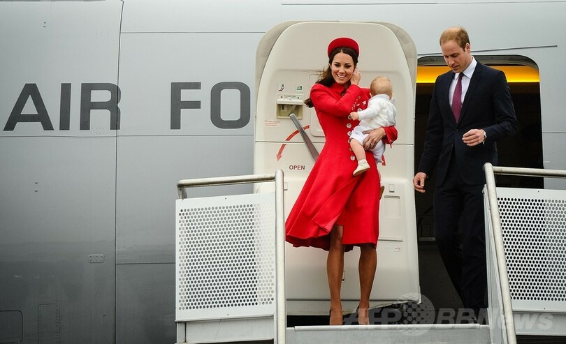 【4月7日 AFP】英国のウィリアム王子(Prince William)とキャサリン妃(Catherine, Duchess of Cambridge)夫妻は7日、長男のジョージ王子(Prince George)を伴ってニュージーランドの首都ウェリントン(Wellington)に到着した。生後8か月のジョージ王子にとって初の外遊となる。