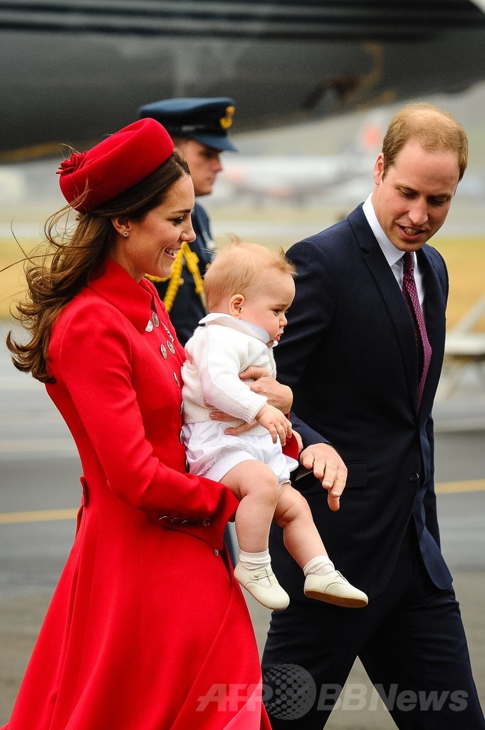 【4月7日 AFP】英国のウィリアム王子(Prince William)とキャサリン妃(Catherine, Duchess of Cambridge)夫妻は7日、長男のジョージ王子(Prince George)を伴ってニュージーランドの首都ウェリントン(Wellington)に到着した。生後8か月のジョージ王子にとって初の外遊となる。
