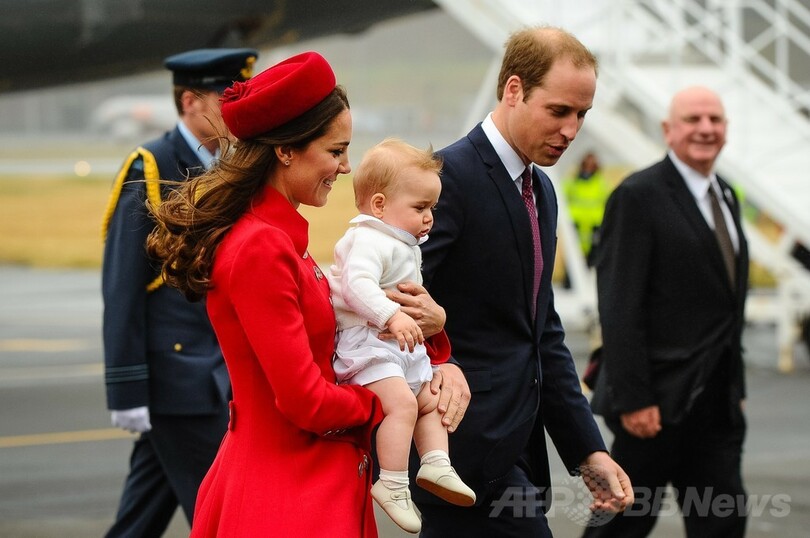 【4月7日 AFP】英国のウィリアム王子(Prince William)とキャサリン妃(Catherine, Duchess of Cambridge)夫妻は7日、長男のジョージ王子(Prince George)を伴ってニュージーランドの首都ウェリントン(Wellington)に到着した。生後8か月のジョージ王子にとって初の外遊となる。