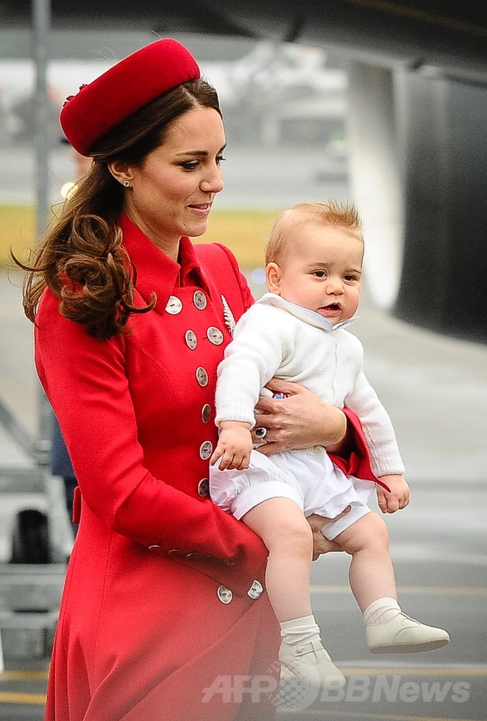 【4月7日 AFP】英国のウィリアム王子(Prince William)とキャサリン妃(Catherine, Duchess of Cambridge)夫妻は7日、長男のジョージ王子(Prince George)を伴ってニュージーランドの首都ウェリントン(Wellington)に到着した。生後8か月のジョージ王子にとって初の外遊となる。