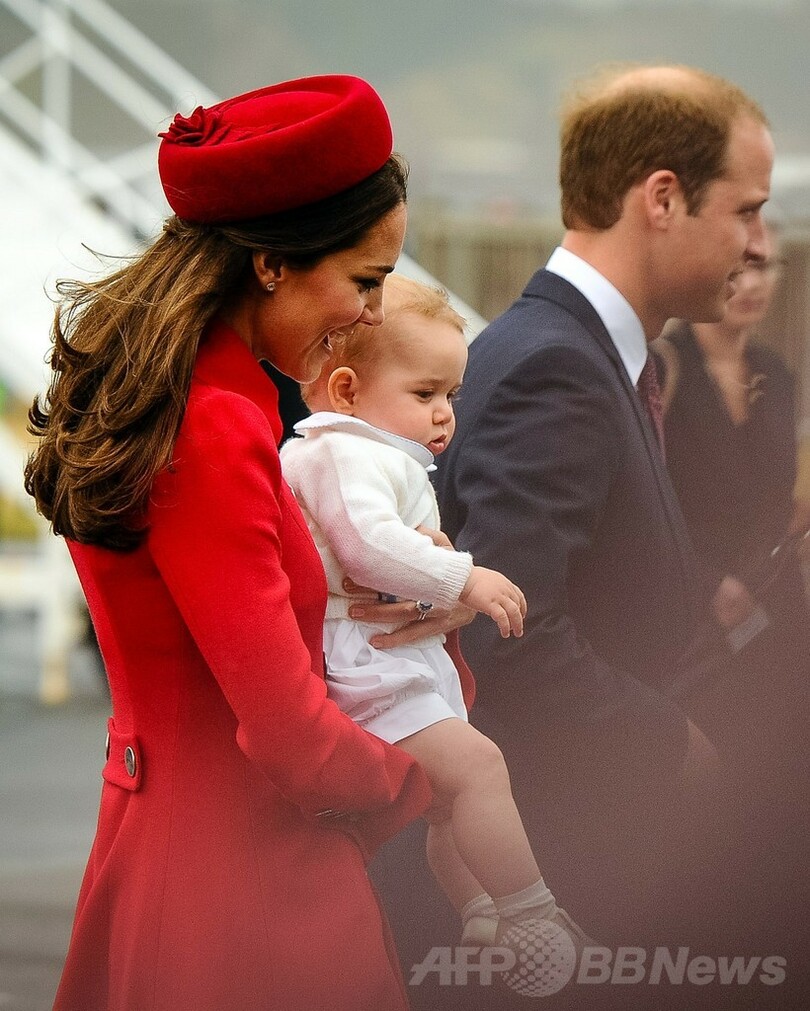 【4月7日 AFP】英国のウィリアム王子(Prince William)とキャサリン妃(Catherine, Duchess of Cambridge)夫妻は7日、長男のジョージ王子(Prince George)を伴ってニュージーランドの首都ウェリントン(Wellington)に到着した。生後8か月のジョージ王子にとって初の外遊となる。