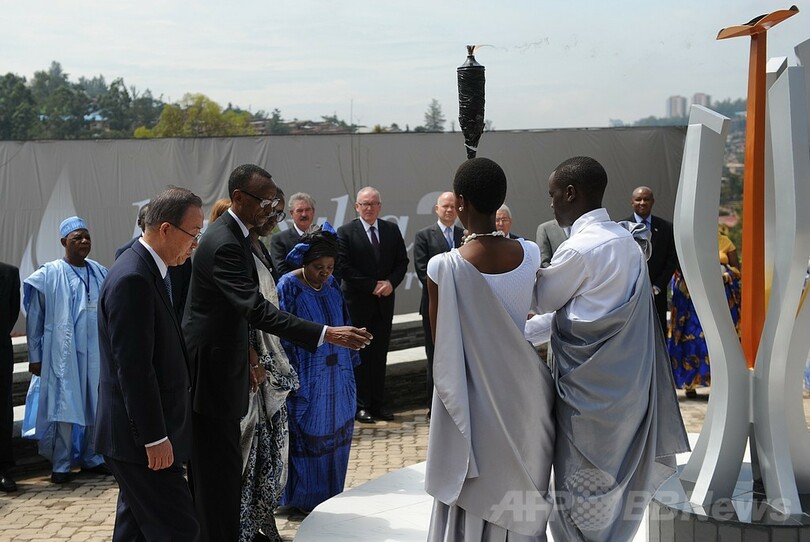 公式の追悼期間は3か月前に始まった。国内各地の町や村をまわった大虐殺の記憶を象徴する炎のトーチは7日、犠牲者のうち25万人の遺骨が眠る虐殺記念館に到着した。カガメ大統領がこのトーチを使って、虐殺が続いた期間と同じ100日間にわたって燃え続ける炎を点火した。(c)AFP/Peter MARTELL