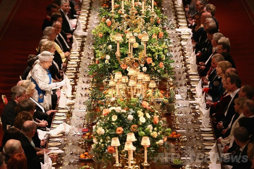 英国のエリザベス女王(Queen Elizabeth II)、デービッド・キャメロン(David Cameron)首相らが出席した晩さん会は、かつて敵対していた両国間で近年進む関係改善をさらに強固にすることが狙い。両国の関係は、エリザベス女王が2011年にアイルランドを訪問したことで、新局面を迎えていた。