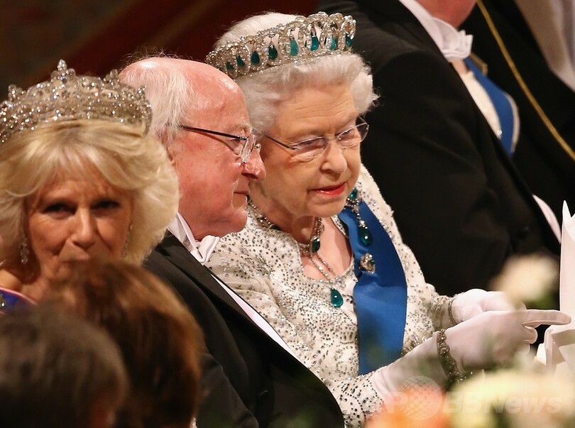 英国のエリザベス女王(Queen Elizabeth II)、デービッド・キャメロン(David Cameron)首相らが出席した晩さん会は、かつて敵対していた両国間で近年進む関係改善をさらに強固にすることが狙い。両国の関係は、エリザベス女王が2011年にアイルランドを訪問したことで、新局面を迎えていた。