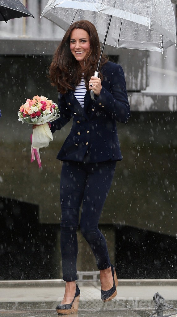 一方、マリンテイストあふれる紺と白の服装に身を包んだキャサリン妃は、ヨット上から数千人の観衆に静かに親指を立ててみせた。(c)AFP
