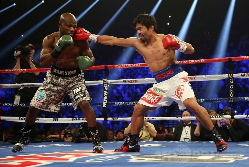 【4月13日 AFP】ボクシング、WBO世界ウェルター級タイトルマッチ12回戦が12日、米ネバダ(Nevada)州ラスベガス(Las Vegas)のMGMグランド・ガーデン・アリーナ(MGM Grand Garden Arena)で行われ、マニー・パッキャオ(Manny Pacquiao、フィリピン)が判定の末3-0(118-110、116-112、116-112)でティモシー・ブラッドリー(Timothy Bradley、米国)を下し、王座を獲得した。