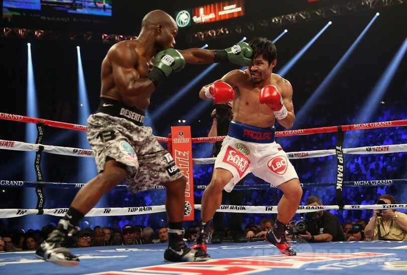 【4月13日 AFP】ボクシング、WBO世界ウェルター級タイトルマッチ12回戦が12日、米ネバダ(Nevada)州ラスベガス(Las Vegas)のMGMグランド・ガーデン・アリーナ(MGM Grand Garden Arena)で行われ、マニー・パッキャオ(Manny Pacquiao、フィリピン)が判定の末3-0(118-110、116-112、116-112)でティモシー・ブラッドリー(Timothy Bradley、米国)を下し、王座を獲得した。