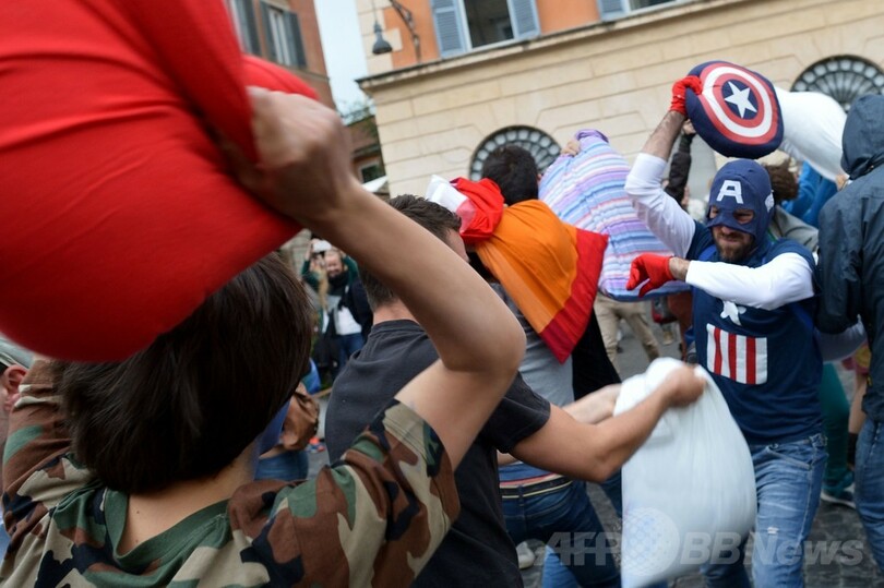 ニュース ライフ スパイダーマンも参戦?ローマで「枕叩き」イベント開催 2014年4月14日 20:33 発信地:ローマ/イタリア [ ヨーロッパ イタリア ] このニュースをシェア ‹ › ❮ 8/9 ❯ イタリア・ローマ(Rome)で開催された「ピローファイト(Pillow Fight)」に参加した人々(2014年4月13日撮影)。(c)AFP/ALBERTO PIZZOLI 画像作成中 ! 【4月14日 AFP】イタリア・ローマ(Rome)で13日、枕を手に相手と叩き合う「ピローファイト(Pillow Fight)」のイベントが行われ、大勢の人々が参加した。(c)AFP ライフ 一覧へ> メディア・報道関係・法人の方向け 写真・動画 購入のお問合せ>