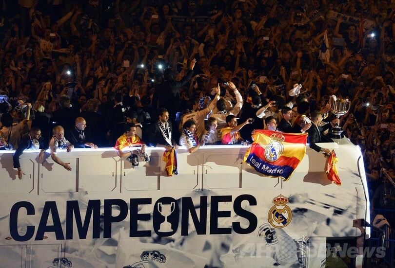【4月17日 AFP】16日に行われたサッカースペイン国王杯(Copa del Rey 2013-14)決勝でFCバルセロナ(FC Barcelona)を2-1で下し、優勝を飾ったレアル・マドリード(Real Madrid)が17日未明、マドリード(Madrid)に凱旋し、中心部のシベレス広場(Cibeles Square)で「王者」と記されたオープントップの2階建てバスに乗り、パレードを行った。(c)AFP