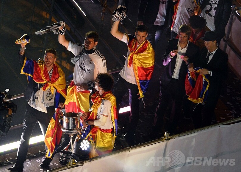 【4月17日 AFP】16日に行われたサッカースペイン国王杯(Copa del Rey 2013-14)決勝でFCバルセロナ(FC Barcelona)を2-1で下し、優勝を飾ったレアル・マドリード(Real Madrid)が17日未明、マドリード(Madrid)に凱旋し、中心部のシベレス広場(Cibeles Square)で「王者」と記されたオープントップの2階建てバスに乗り、パレードを行った。(c)AFP