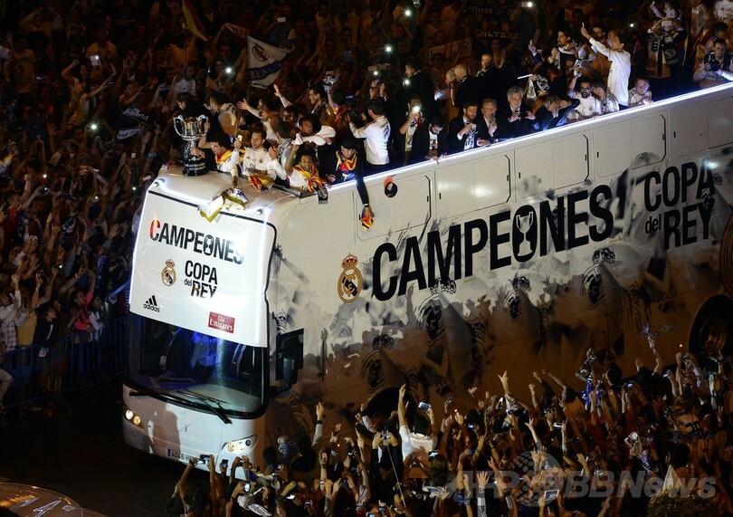 【4月17日 AFP】16日に行われたサッカースペイン国王杯(Copa del Rey 2013-14)決勝でFCバルセロナ(FC Barcelona)を2-1で下し、優勝を飾ったレアル・マドリード(Real Madrid)が17日未明、マドリード(Madrid)に凱旋し、中心部のシベレス広場(Cibeles Square)で「王者」と記されたオープントップの2階建てバスに乗り、パレードを行った。(c)AFP