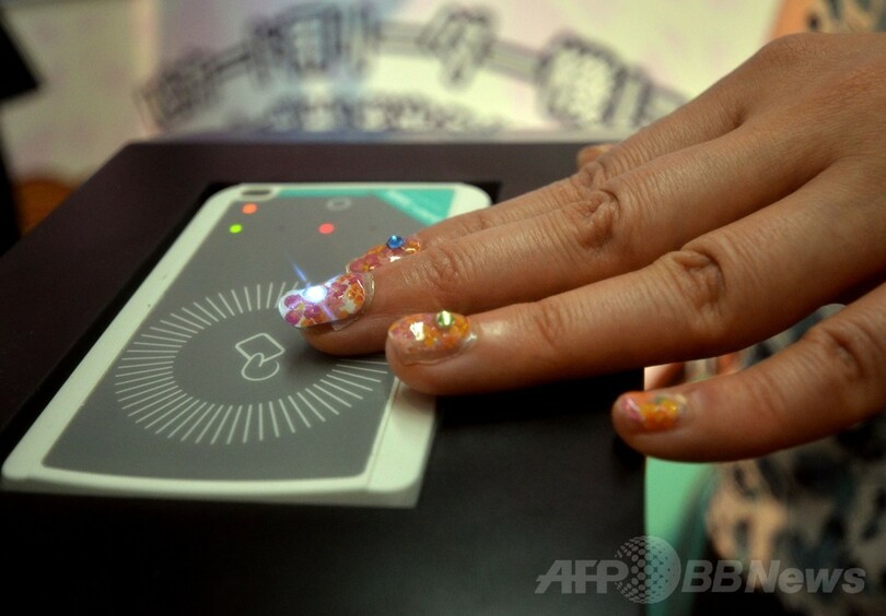 ルミデコネイルにはLEDと小型アンテナが付いている。NFC技術はおサイフケータイや基本ソフト(OS)アンドロイド(Android)を搭載したスマートフォン、スマートカードリーダー、ゲームコントローラーなどで使われている。(c)AFP
