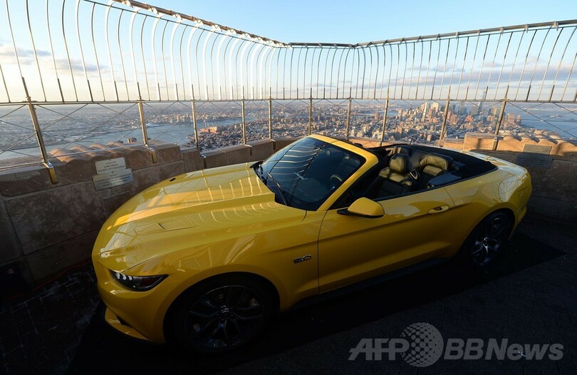 【4月18日 AFP】米自動車大手フォード・モーター(Ford Morter)は16日、名車「マスタング(Ford Mustang)」誕生50周年を記念し、ニューヨーク(New York)のエンパイアステートビル(Empire State Building)86階の展望台に新型の「マスタング・コンバーチブル2015年モデル(2015 Mustang Convertible)」を展示した。