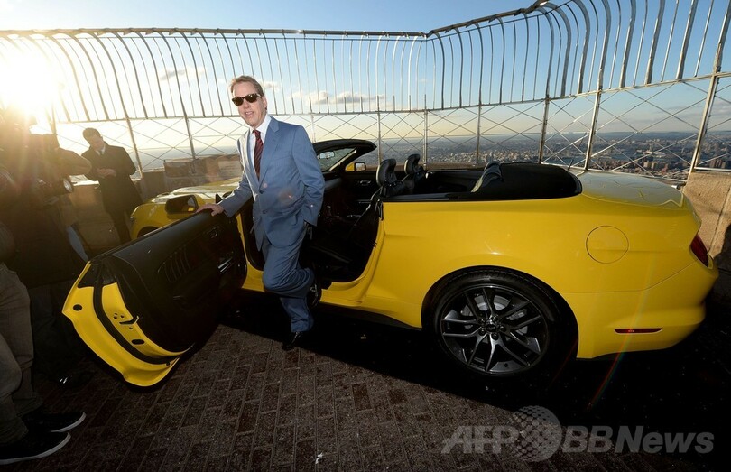 【4月18日 AFP】米自動車大手フォード・モーター(Ford Morter)は16日、名車「マスタング(Ford Mustang)」誕生50周年を記念し、ニューヨーク(New York)のエンパイアステートビル(Empire State Building)86階の展望台に新型の「マスタング・コンバーチブル2015年モデル(2015 Mustang Convertible)」を展示した。