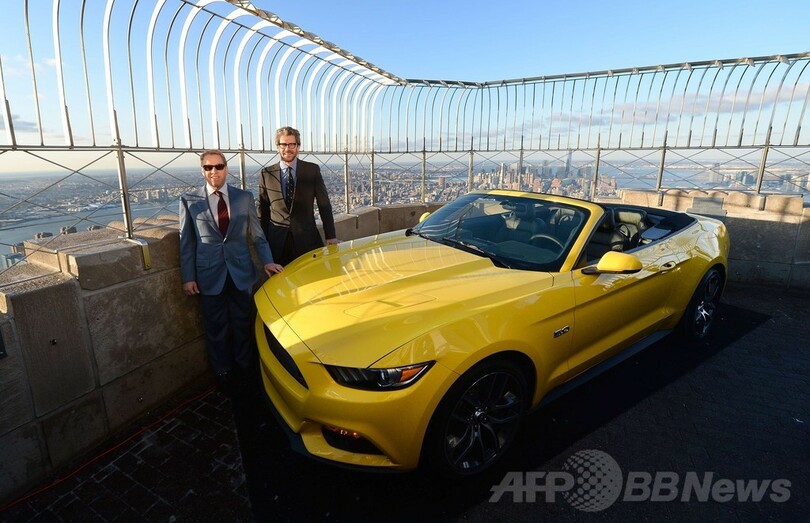 【4月18日 AFP】米自動車大手フォード・モーター(Ford Morter)は16日、名車「マスタング(Ford Mustang)」誕生50周年を記念し、ニューヨーク(New York)のエンパイアステートビル(Empire State Building)86階の展望台に新型の「マスタング・コンバーチブル2015年モデル(2015 Mustang Convertible)」を展示した。