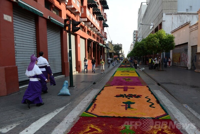 旧市街の中心を走る通りに、キリスト教のイースター(復活祭)に合わせ、5000人のボランティアたちが早朝から7時間かけて色とりどりに染められたおがくずと花を丁寧に敷き詰めた。使用したおがくずは5万4400キロに上るという。(c)AFP