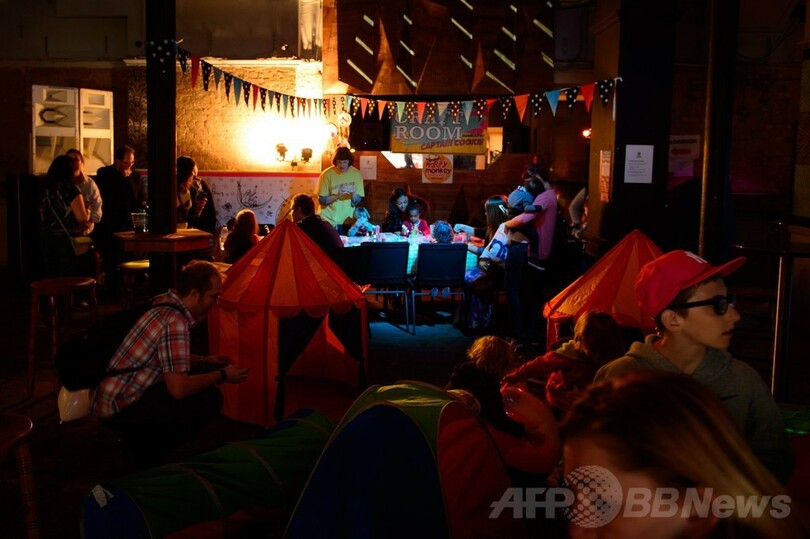 「素晴らしいアイデアだ。ビールにダンスに子どもたち。他に必要なものなんてあるかい?」とダンスフロアでカミールちゃんを抱きながら踊るポールさん(34)は満足げに語った。(c)AFP/Alice RITCHIE
