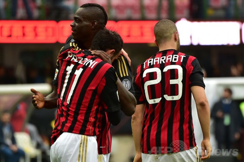ミランは前半終了間際にマリオ・バロテッリ(Mario Barwauh Balotelli)のゴールで先制すると、後半6分にアデル・ターラブト(Adel Taarabt)、同38分にジャンパオロ・パッツィーニ(Giampaolo Pazzini)が追加点を挙げ、勝ち点3を手にした。(c)AFP